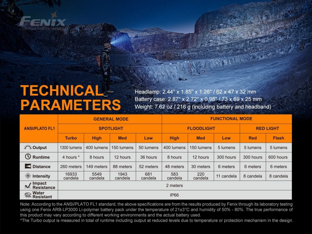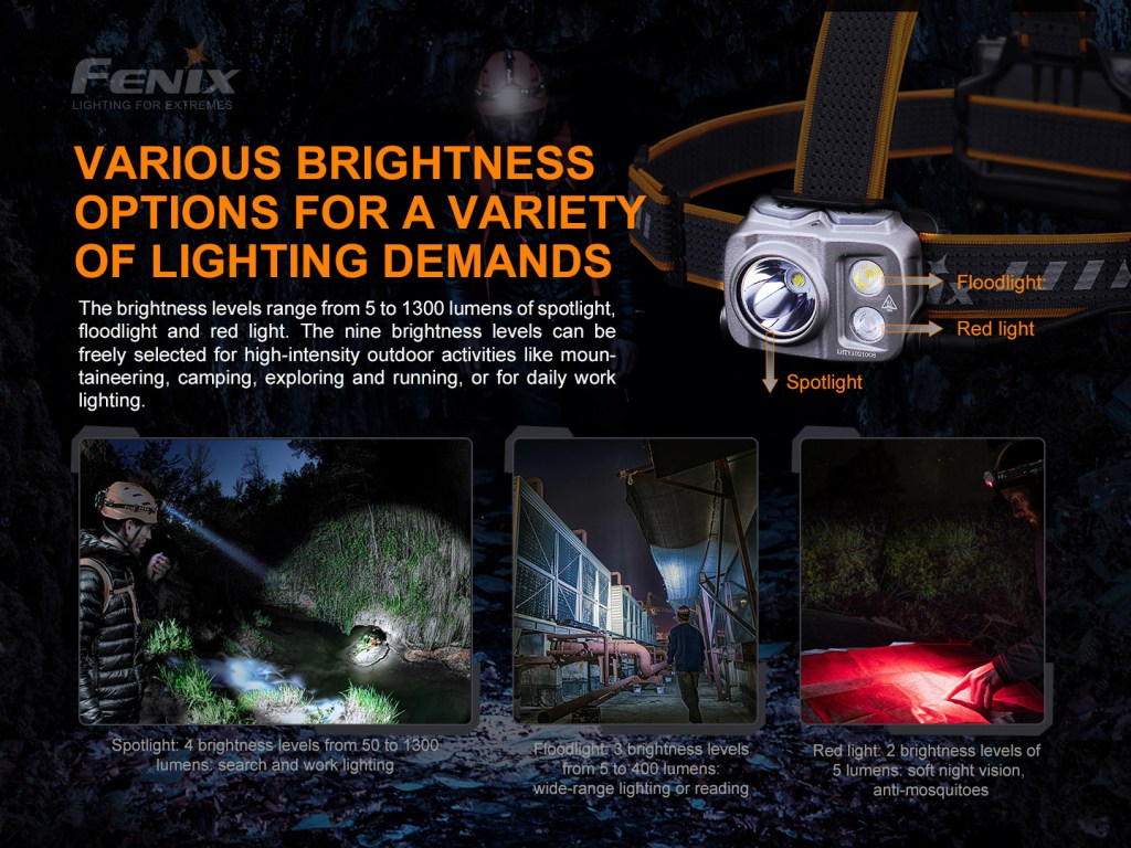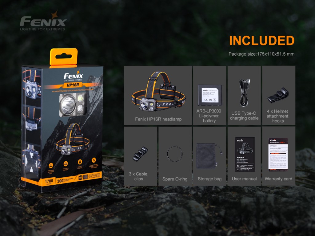 The Fenix HP16R is a rechargeable high-performance outdoor headlamp. The spot- and floodlight can be used simultaneously or separately to deliver a max output of 1700 lumens, runtime of 300 hours and a far-reaching beam of 260 meters. The HP16R is a headlamp with a separate battery case, powered by the included Fenix ARB-LP3000 Li-polymer battery pack, or the headlamp can also run on 4 Ni-MH/Alkaline AA batteries. Additionally, the headlamp is rechargeable via the USB Type-C port in the battery case. The HP16R will be an indispensable aid in your mountaineering, searching, snow-hiking or any other challenging outdoor activities.