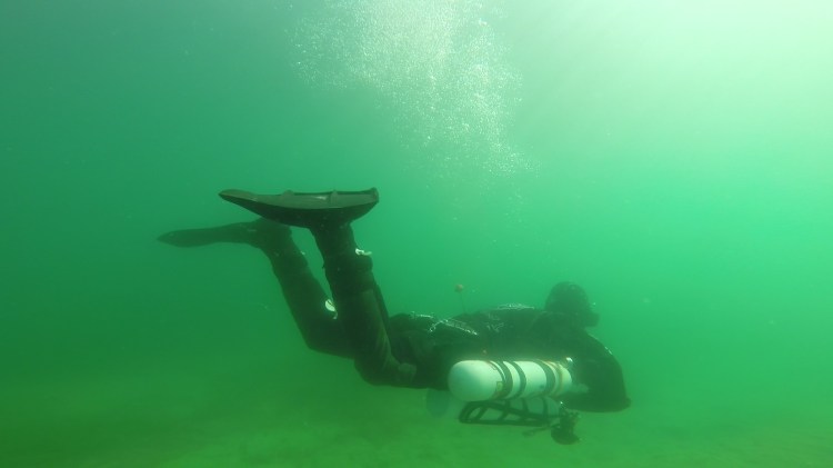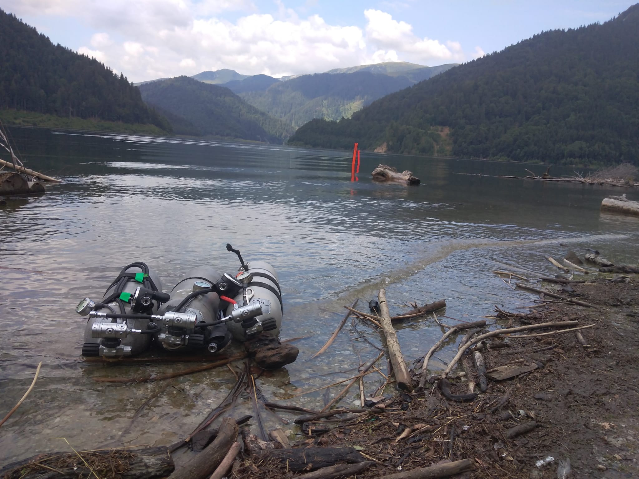 - echipament pentru scufundare în configurația side mount : vestă, regulatoare, butelii echipate de minim 10l;
