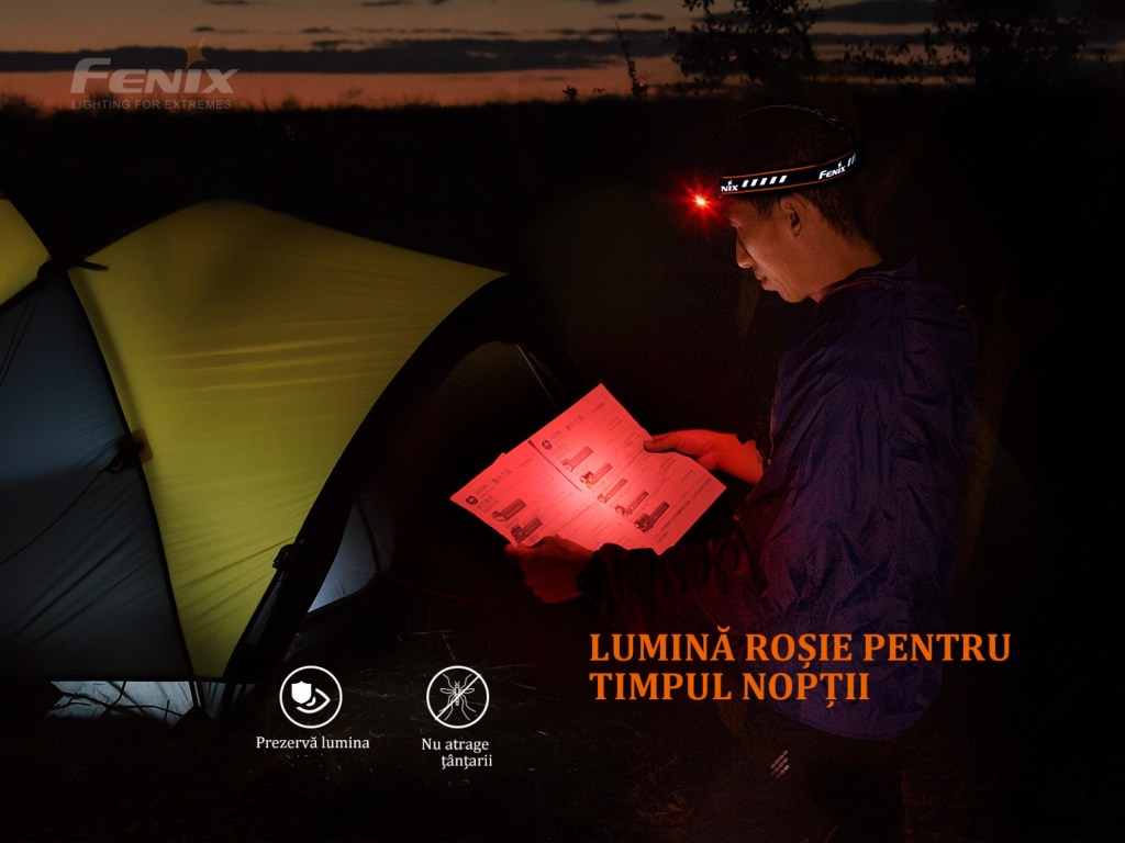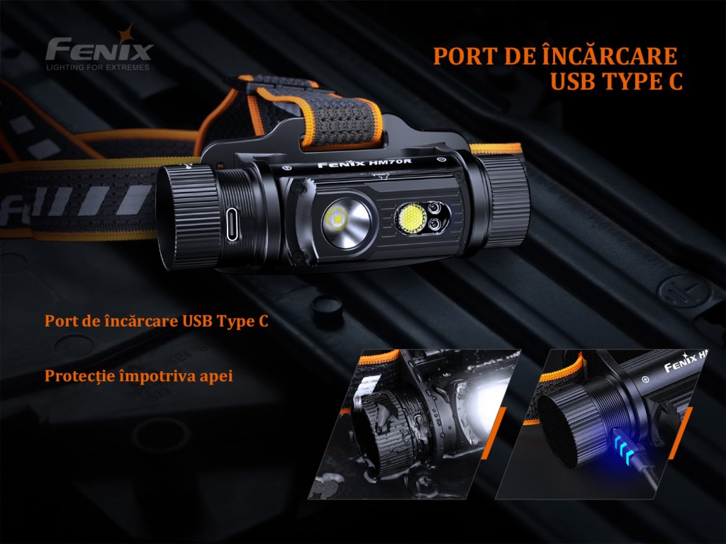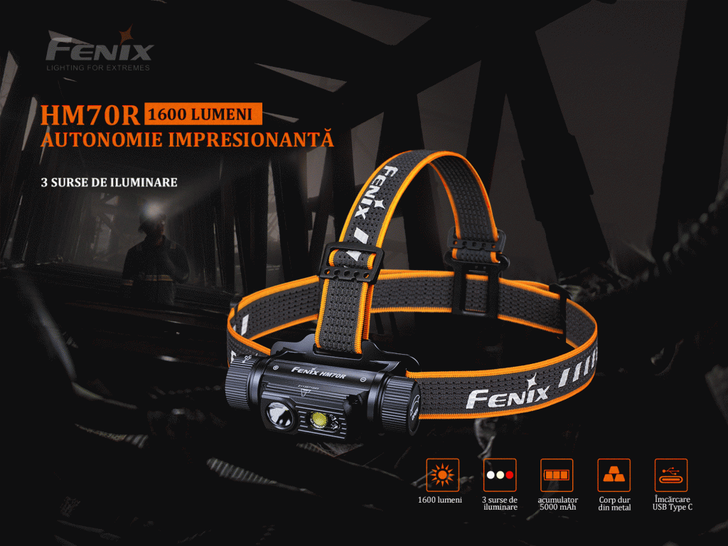 Fenix HM70R este o lanternă frontală reîncărcabilă cu o intensitate maximă de 1600 lumeni pe o distanță maximă a fasciculului de 186 de metri. Acumulatorul invlus 21700 de 5000 mAh permite lanternei sa funcționeze pentru 100 ore pe treapta low – 30 de lumeni.