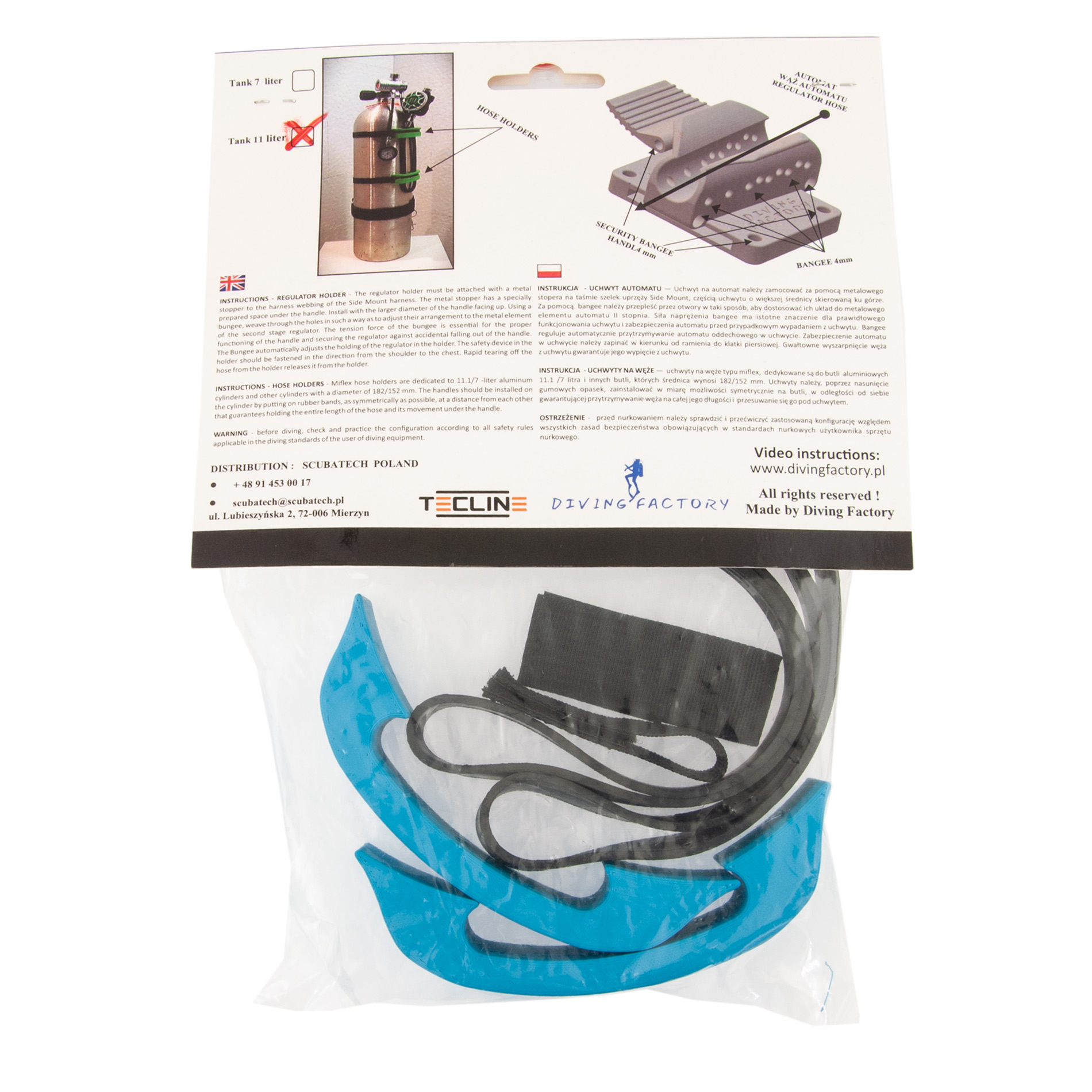 INSTRUCTIONS – HOSE HOLDERS – Miflex hose holders are dedicated to 11.1/7 -liter aluminum cylinders and other cylinders with a diameter of 182/152 mm. The handles should be installed on the cylinder by putting on rubber bands, as symmetrically as possible, at a distance from each other that guarantees holding the entire length of the hose and its movement under the handle.