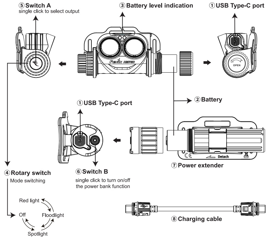 - Modulul bateriei auxiliare este prevăzut cu QR (quick-release) pentru diferite moduri de purtare și poate fi folosit ca power-bank de urgență.