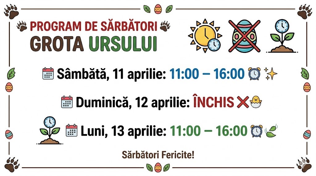 👶 Copii de până la 14 ani – 10 lei (copiii sub 5 ani beneficiază de gratuitate); 🧗♂️ Speologii, 🚒 Salvatorii Montani și Salvatorii Speologi legitimați la asociații de profil au acces gratuit!