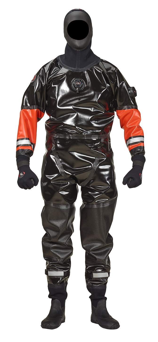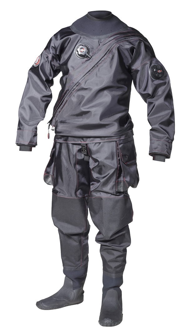 Costume uscate confecționate din Cordura, Sofdura, Kevlar, HL Trilaminate, 4-tex Dive și Poliureatan. Cagule, valve, sigilii și sisteme de etanșare la gât și mâneci, manuși uscate, fermoare, cizme și alte opționale personalizate în funcție de preferințele.
