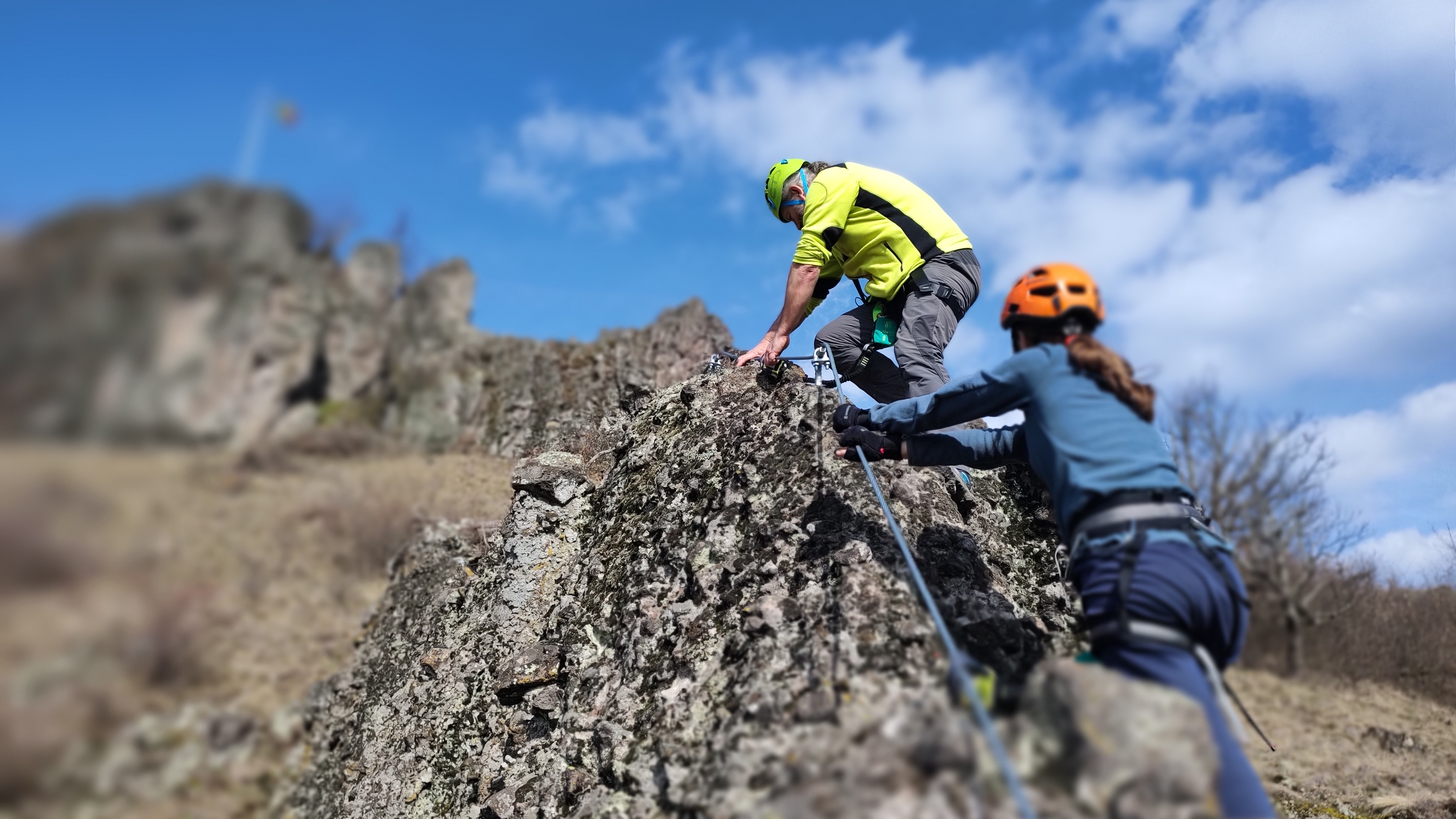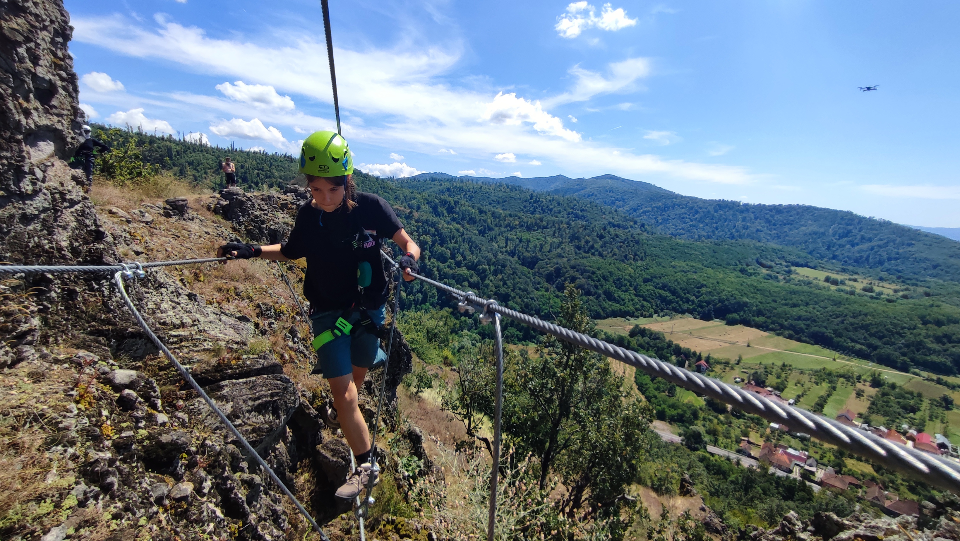 Descrierea traseului: Traseul de Via Ferrata – Cetate Dezna are două sectoare amenajate pe stâncile din aglomerate vulcanice localizate pe versantul de sub Cetatea Dezna.